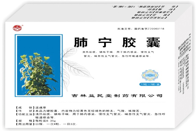 | 药品名称 | 肺宁胶囊 | | 汉语拼音 | Feining Jiaonang | | 主要成分 | 返魂草 | | 性状 | 本品为硬胶囊,内容物为棕黄色至棕褐色的粉末;气微,味微苦。 | | 功能主治 | 清热祛痰,镇咳平喘。用于肺内感染,慢性支气管炎,喘息性支气管炎,急性呼吸道感染等。 | | 用法用量 | 口服。一次4粒,一日3次。 | | 不良反应 | 尚不明确 | | 禁忌 | 尚不明确 | | 注意事项 | 尚不明确 | | 规格 | 每粒装0.35g。 | | 贮藏 | 密封。 | | 包装 | 药用铝塑板,12粒×3板/盒 | | 有效期 | 36个月 | | 执行标准 | 国家食品药品监督管理局国家药品标准YBZ02832006-2009Z | | 批准文号 | 国药准字Z20060118 | | 生产企业 | 吉林益民堂制药有限公司 | |