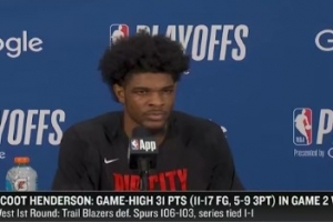 体育资讯4月22日讯 西部首轮系列赛G2,开拓者106-103力克马刺大比分1-1平。赛后亨德森接受了采访,以下为采访全文。