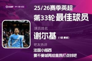 2025-2026赛季英超火热进行中,体育资讯和咪咕体育联合发起每轮英超最佳球员评选活动!第33轮评选结果已经出炉,曼城中场谢尔基连续2轮当选,本轮评选获得吧友38178张票,得票率56.4%!