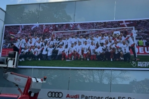 拜仁提前4轮获得本赛季德甲冠军,媒体指出,巨大的夺冠庆祝照片出现在拜仁训练基地的外墙上,取代了合作伙伴奥迪的广告牌。