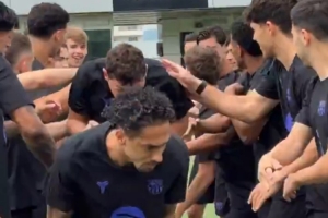 体育资讯4月29日讯 巴萨官方更新社媒动态,晒出球员们欢迎拉菲尼亚、贝尔纳尔、克里斯滕森回归的视频。